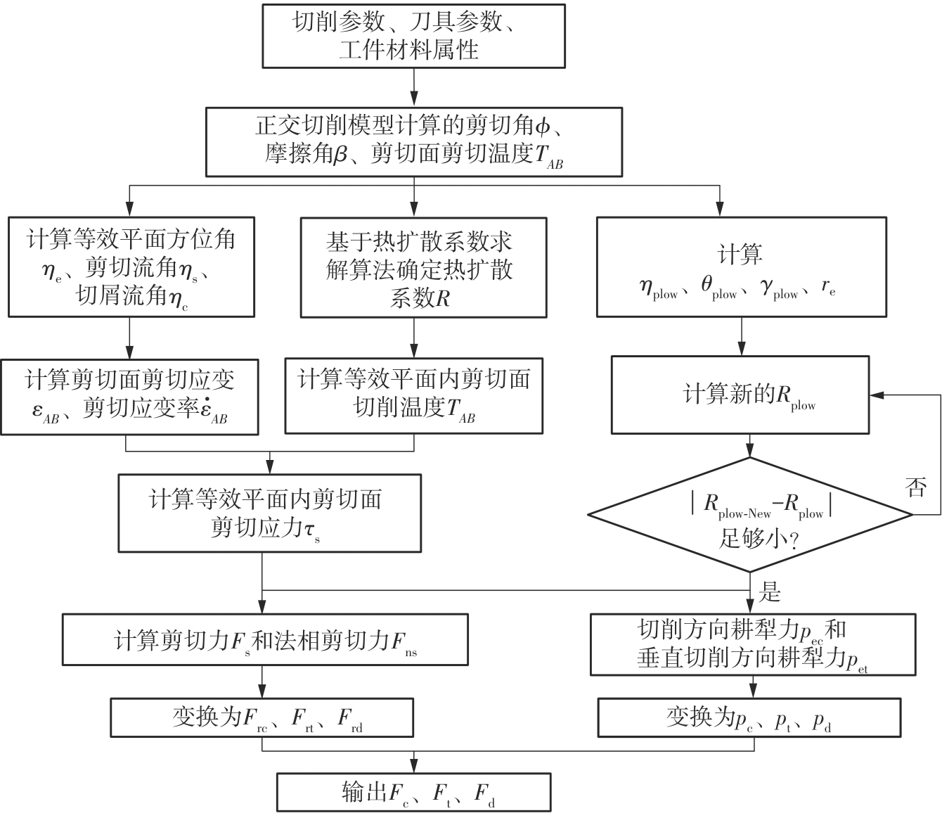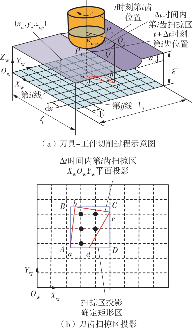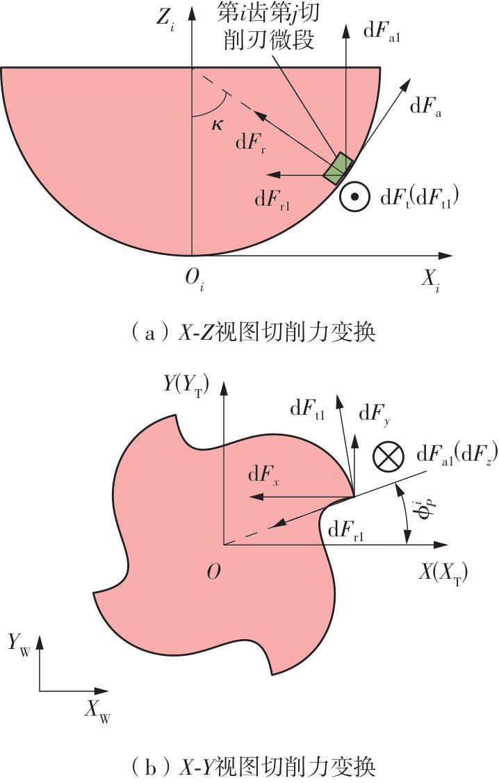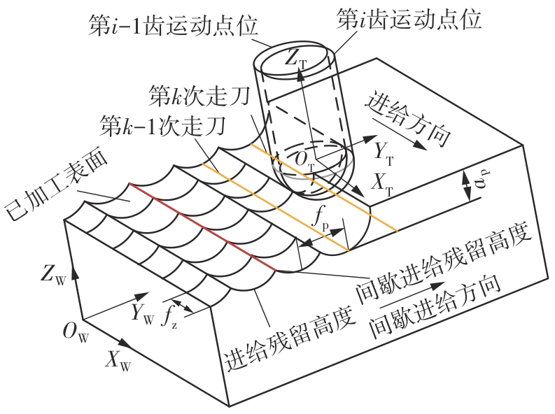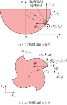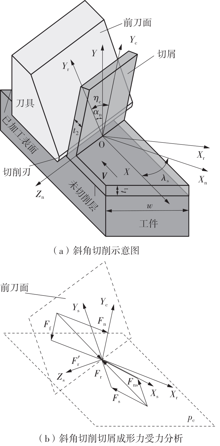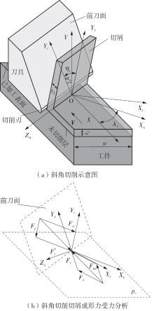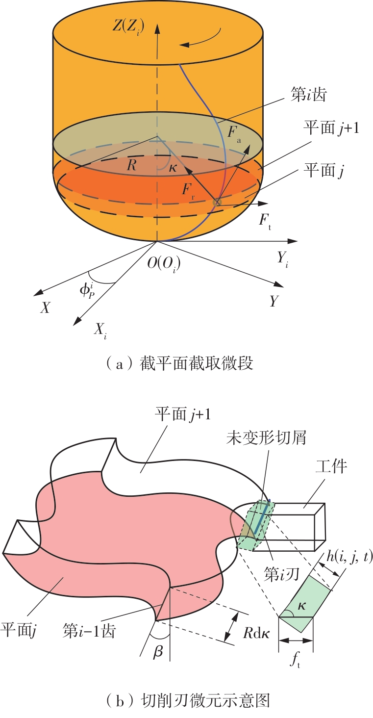 针对球头铣刀在变刃倾角条件下切削时所呈现的三维力场分布复杂、未变形切屑厚度动态变化显著等特点,为实现球头铣刀多轴铣削过程中切削力的高精度建模与预测,提出了一种融合斜角切削理论与动态运动学仿真的铣削力建模方法。基于等效平面法建立斜角切削力学解析框架,通过空间坐标变换将三维切削转化为二维平面切削,推导同时包含剪切效应与耕犁效应的复合力学模型,揭示了刃倾角对切削区材料流动方向、剪切变形区形态以及应力分布的调控机制;其次建立球头铣刀刃线几何特征,结合刀具-工件运动学耦合模型,求解刀齿运动微分方程,并通过改进型Z-MAP算法实现动态加工表面形貌仿真,提取时变未变形切屑厚度分布;进而提出一种多尺度力学映射策略,将刀具刃口沿曲线方向离散为微元切削单元,基于斜角切削解析模型对各微元的切向力、径向力与轴向力进行迭代积分,最终叠加得到完整的三维铣削力时域信号。最后开展实验验证,结果表明:模型在轴向、进给方向与切宽方向的铣削力预测最大误差分别为18.3%、10.8%与22.4%,验证了模型在复杂几何刀具受力分析中的准确性与适用性。该研究方法融合了宏观运动学仿真与微观力学解析,可为球头铣刀的工艺参数优化、刀具结构设计与加工稳定性提升提供理论支撑。