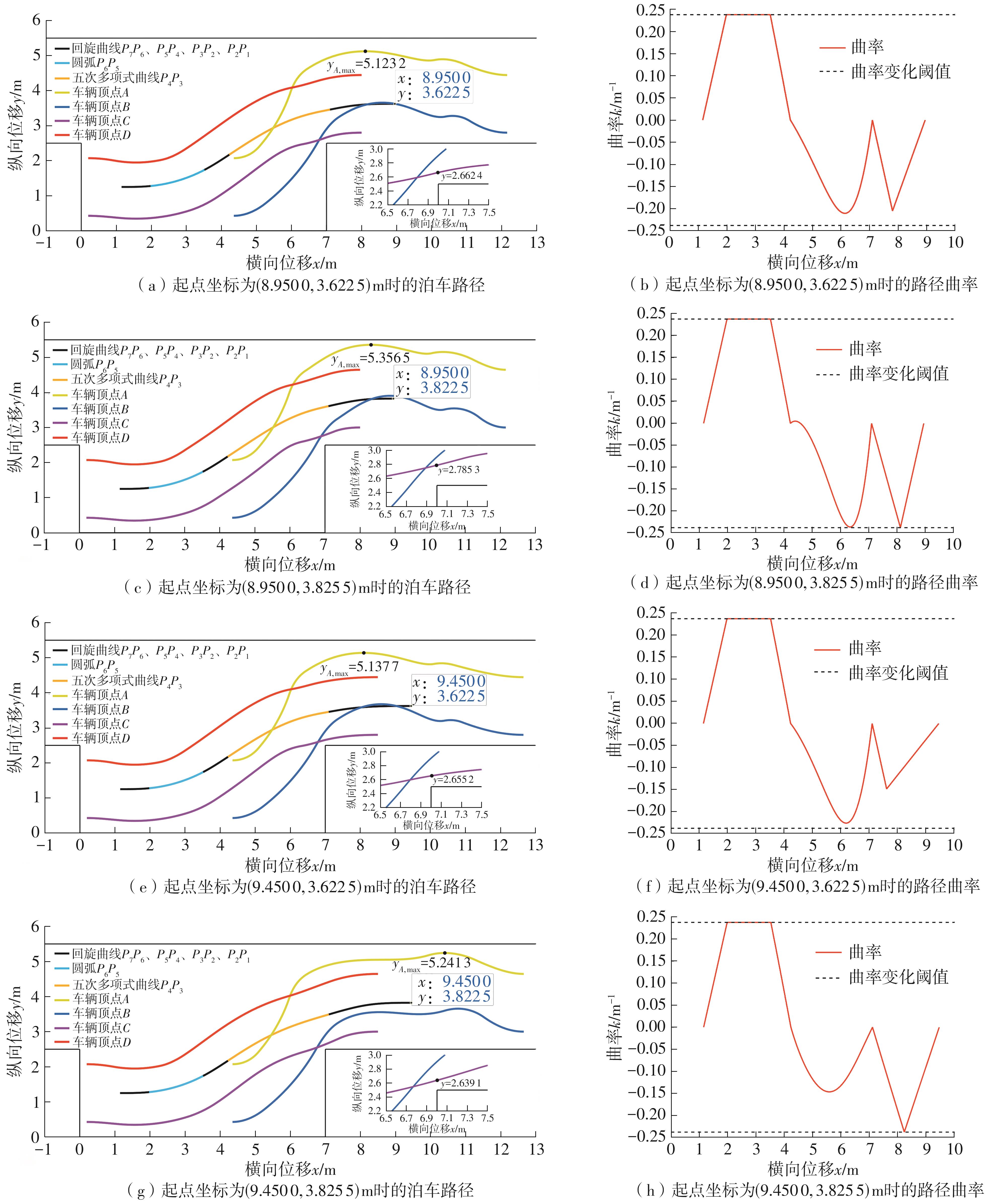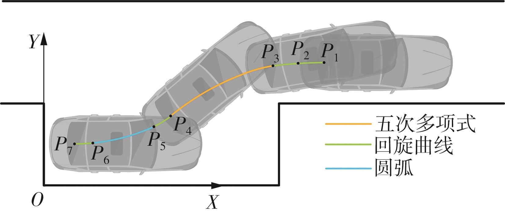 针对城市狭窄通道场景中平行泊车时存在的路径曲率突变、碰撞风险高及多次调整等问题,该文提出一种基于曲线组合与数值优化的三段式单步路径规划方法,以优化车辆的转向性能与动态避障能力,提升泊车效率和安全性。首先,基于圆弧与回旋曲线的曲率特性,设计CAC(回旋曲线‒圆弧‒回旋曲线)与CC(回旋曲线‒回旋曲线)两类曲线组合;然后,将泊车过程逆向化,采用CAC曲线组合设计终点段路径,再构建基于CC曲线组合的约束优化模型来规划起点段路径,并引入五次多项式曲线设计中间段路径;最后,采用Matlab在拟可行区域内进行多工况仿真试验。结果表明:该方法能够在通道宽度仅为3 m的狭窄场景中规划出无碰撞、曲率连续的可行路径,且占用的通道较窄;相较于五次多项式曲线和“圆弧‒回旋曲线‒直线”方法,该方法在路径平滑性、避障能力及空间利用率等方面均具有显著优势;模型预测控制跟踪实验显示,车辆能够精准跟踪规划路径且前轮转角连续变化,验证了该方法的有效性。所提出的三段式单步路径规划方法为狭窄通道场景中的平行泊车提供了高效、安全的解决方案,可提高泊车效率,从而有效缓解路边泊车造成的交通阻塞,对提升城市交通效率具有实际意义。
