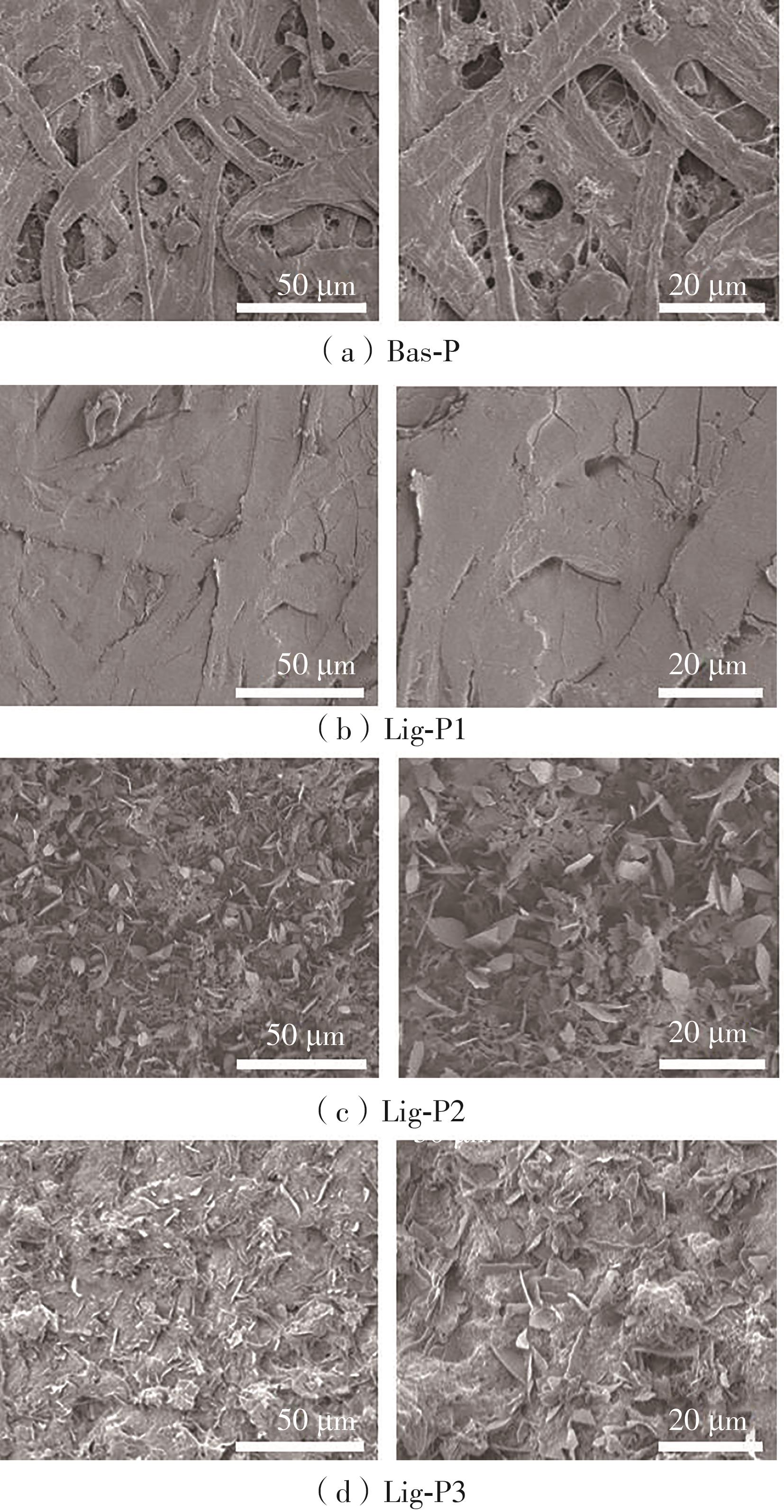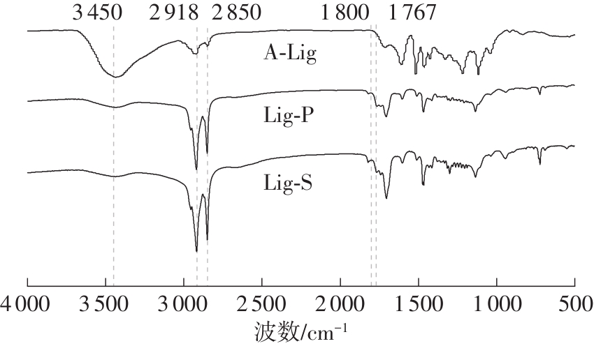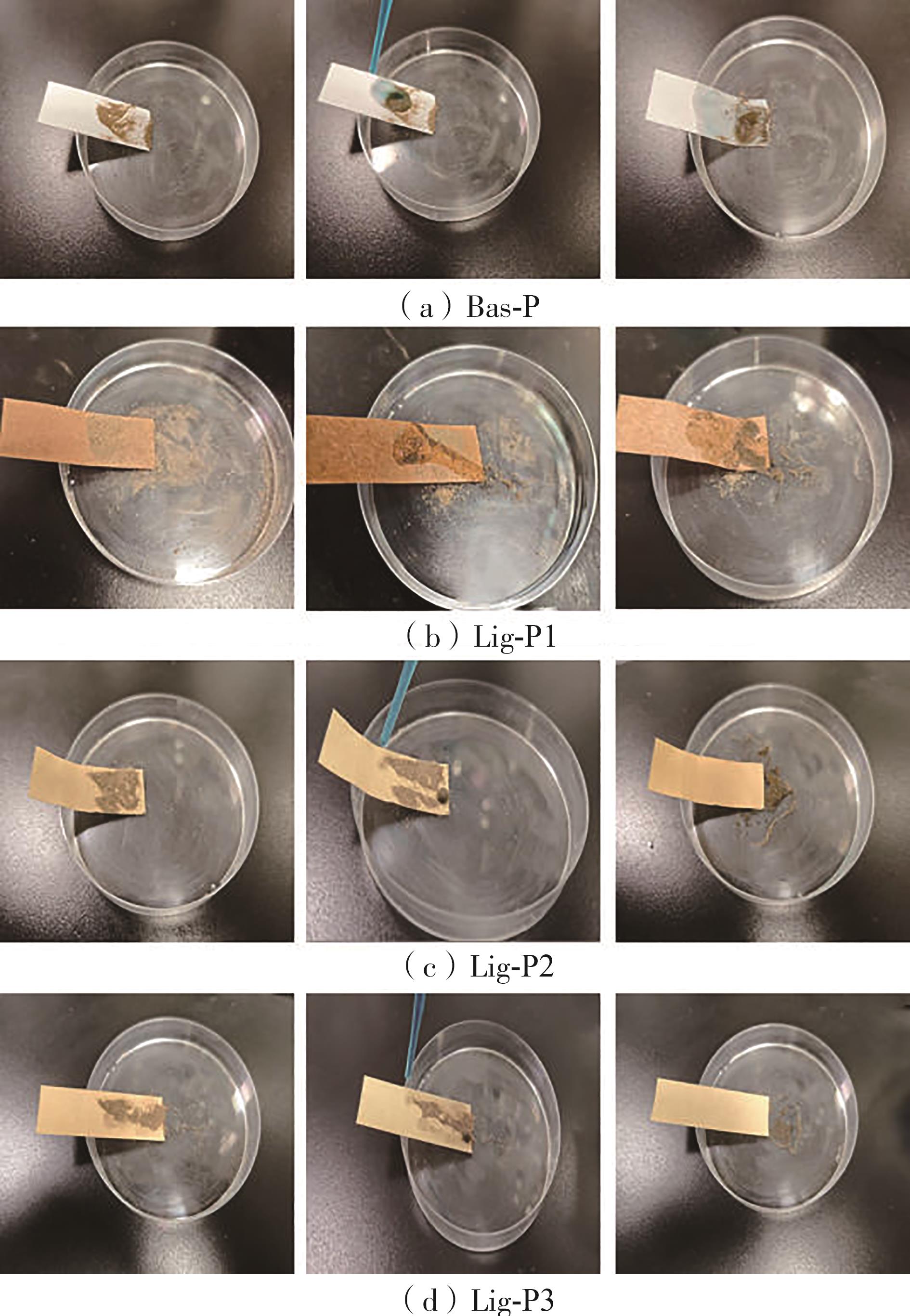 纸张纤维表面存在的大量亲水性羟基,影响了其在阻隔包装领域的应用。当前用于提高纸张阻隔性能的石油基材料多难以降解,而碱木质素凭借天然可降解与疏水、阻燃等特性,在阻隔包装材料的制备方面具有独特优势。为深入探究碱木质素对包装纸疏水性能的影响,该文以碱木质素(A-Lig)为原料,使用棕榈酰氯和硬脂酰氯对A-Lig进行酯化改性,合成了木质素棕榈酸酯(Lig-P)和木质素硬脂酸酯(Lig-S)。然后基于A-Lig、Lig-P和Lig-S 3种木质素配置涂布液,在原纸上使用十字交叉法喷涂,制得系列木质素基涂布纸。采用红外光谱(FTIR)、X射线光电子能谱(XPS)、核磁共振(NMR)、扫描电镜(SEM)、热重(TGA)等分析对A-Lig、Lig-P、Lig-S的化学结构、微观形貌及热性能进行了表征。通过静态水接触角、滚动角、吸水率、纸张表面水稳定性、自清洁性、力学性能等测试对原纸及涂布纸的微观结构、疏水性能和机械强度进行了表征。结果表明:酯化改性后的木质素上羟基被有效取代,脂肪族链被成功接枝,C—O键相对含量减少,热稳定性减弱。原纸(Bas-P)、A-Lig涂布纸(Lig-P1)、Lig-P涂布纸(Lig-P2)、Lig-S涂布纸(Lig-P3)的静态水接触角分别为45.9°、83.5°、150.8°和151.6°;同时,Lig-P2和Lig-P3的滚动角分别为9.3°和3.5°,达到了超疏水效果,且二者的微观表面形成了类花瓣状微纳粗糙结构,其吸水率显著降低,表现出优异的水稳定性和自清洁性能。Lig-P2和Lig-P3相较于Bas-P的拉伸强度略有降低,但断裂伸长率明显提高,纸张柔韧性增强。