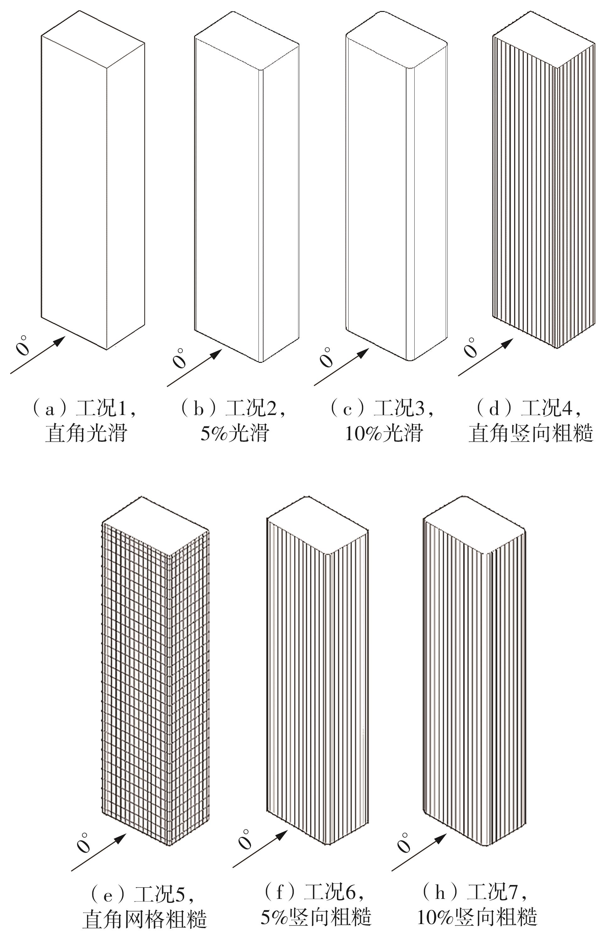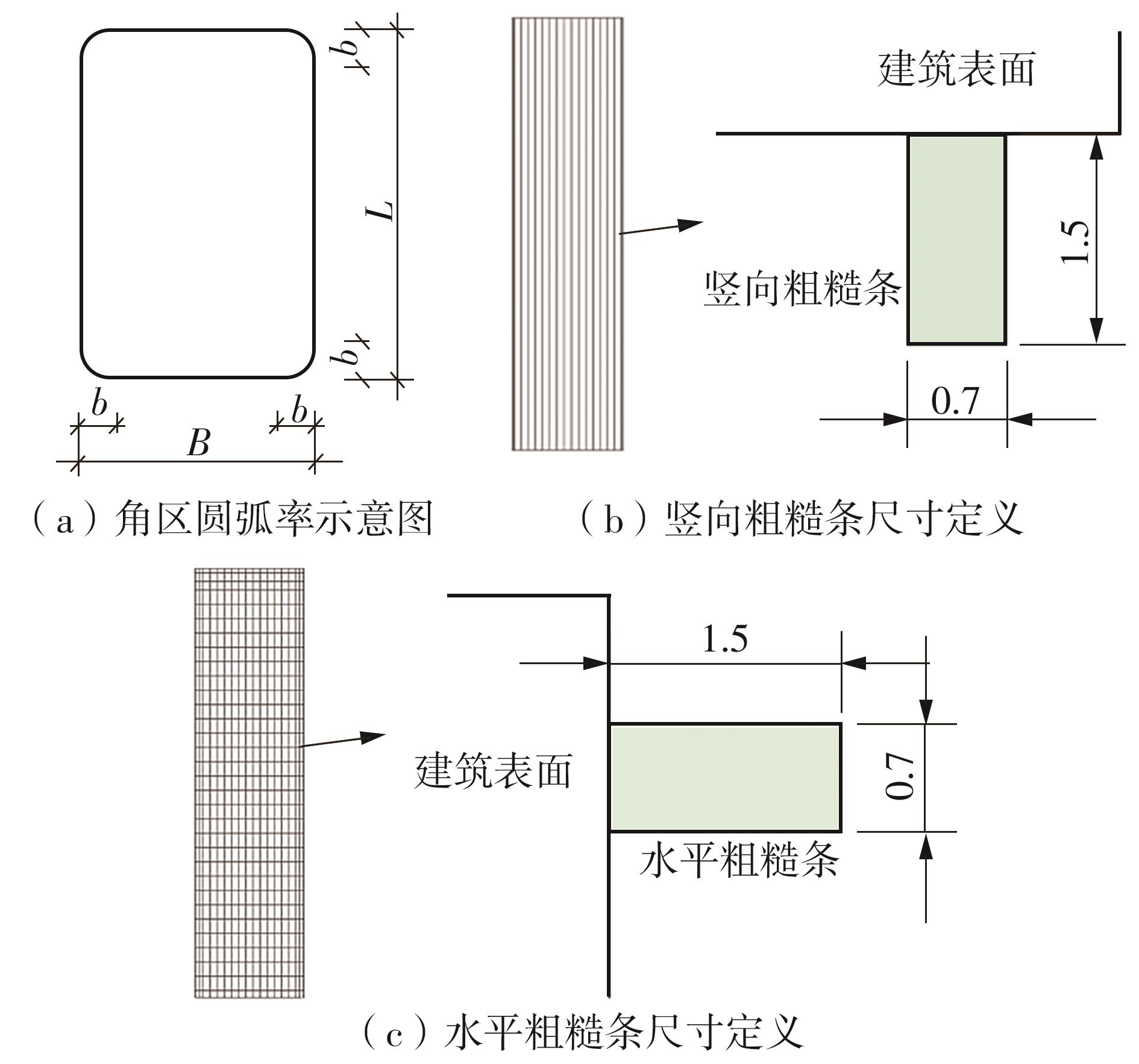 Modern high-rise building façades often feature local elements such as sunshades and vertical decorative strips, and corner areas of buildings commonly adopt design measures like rounding or curving. The influence of these common architectural design features on wind loads cannot be ignored, and the current code needs to be improved., This paper takestook the CAARC high-rise building standard model as the research object, and studied the influence of rough strips and rounded corner on the wind load of the structure through a series of rigid model pressure measurement wind tunnel tests and high-frequency balance force tests. The studies show that: 1) Under the smooth model condition, with the increase of rounding angle from 0% to 10%, the absolute value of the peak negative pressure in the corner area of the windward surface of the building will gradually increase, and with the maximum increase is of about 38.4%; The global body shape coefficients of the structure will gradually decrease, and the maximum reduction of the global body shape coefficients in the X direction and Y direction is about 26.3% and 39.9%, respectively. 2) Under the condition of arranging vertical or grid rough strips with a thickness of 1.5 mm on the surface of the model, it is beneficial to reduce the absolute value of the peak negative pressure in the corner and middle of the structure, with a maximum reduction of 13.68%; For the global body shape coefficients of the structure, the rough strip model is slightly lower than the smooth mode. 3) The influence of arranging rough strips and rounded corner on wind pressure of building corner areas is not a simple superposition relationship. When both rough strips and rounded corner are arranged, the absolute value of the peak negative pressure in the corner area increases, with a maximum increase of 45.1%. 4) After the installation of roughness elements or the rounding of corner areas, the peak value of the crosswind power spectrum decreases, and the dimensionless frequency corresponding to the spectral peak increases.